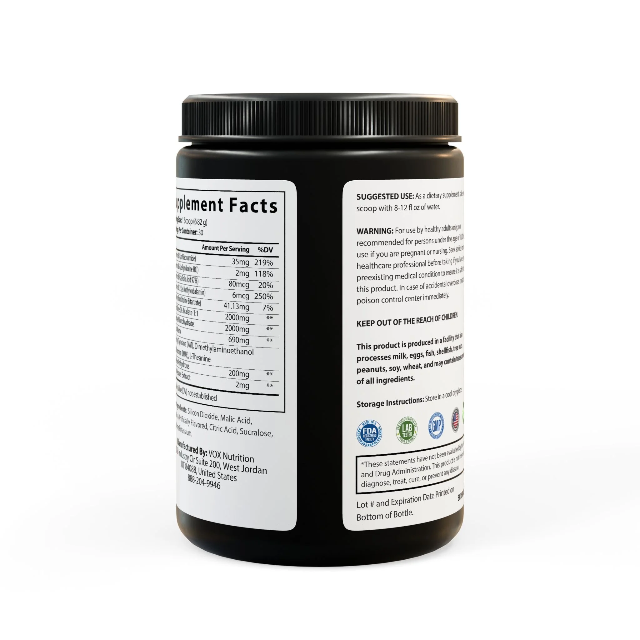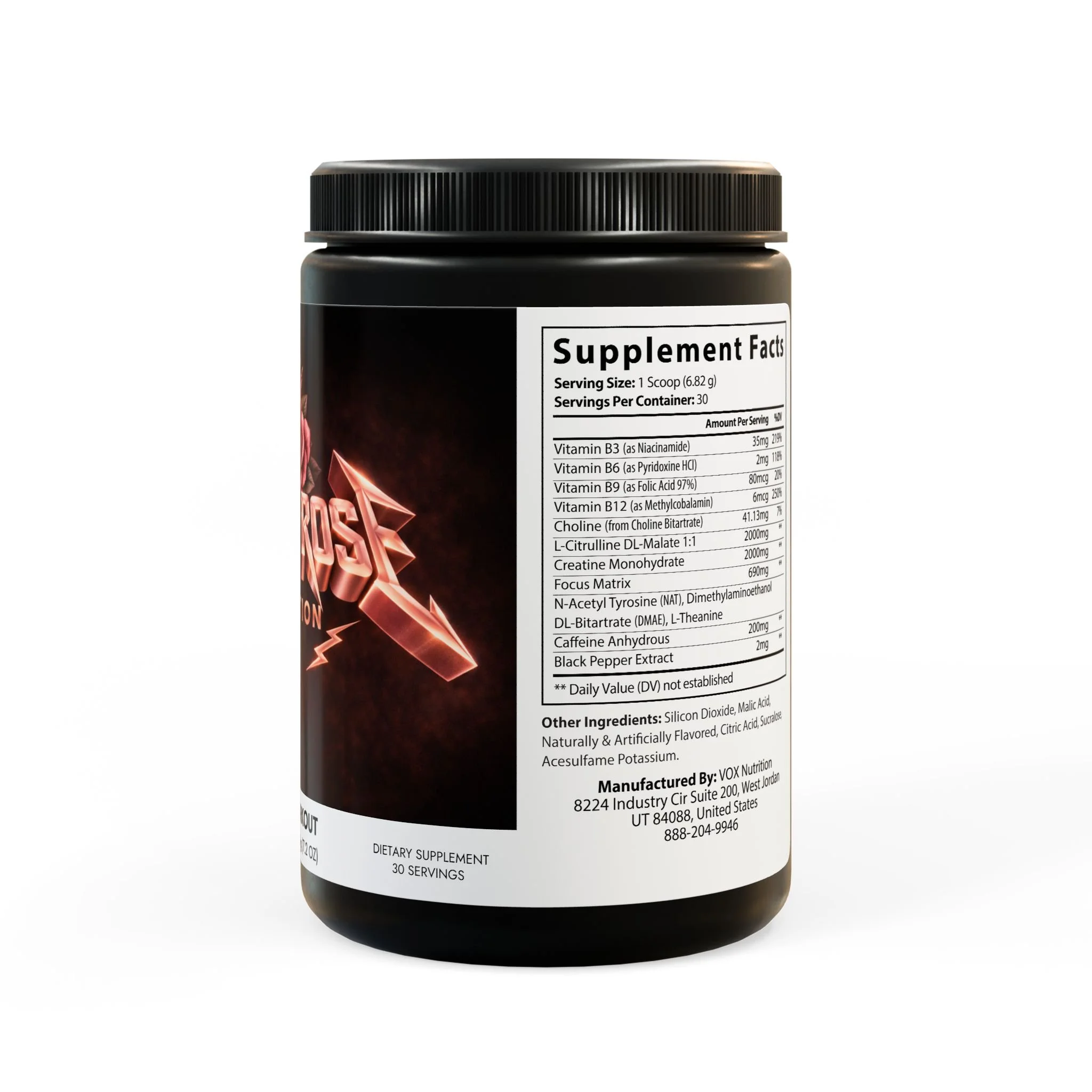 Ingredients: Vitamin B3 (as Niacinamide), Vitamin B6 (as Pyridoxine HCl), Vitamin B9 (as Folic Acid 97%), Vitamin B12 (as Methylcobalamin), Choline (from Choline Bitartrate), L-Citrulline DL-Malate 1:1, Creatine Monohydrate, N-Acetyl Tyrosine (NAT), Dimethylaminoethanol, DL-Bitartrate (DMAE), L-Theanine, Caeine Anhydrous, Black Pepper Extract. Other Ingredients: Silicon Dioxide, Malic Acid, Naturally & Articially Flavored, Citric Acid, Sucralose, Acesulfame Potassium.